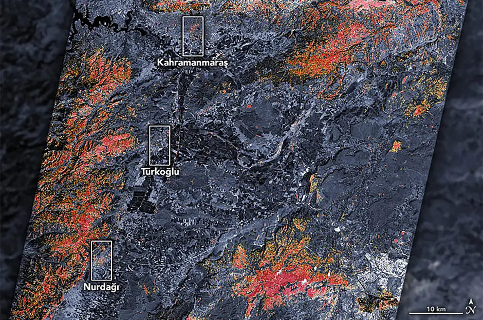ABD Havacılık ve Uzay Ajansı (NASA), 7,7 ve 7,6 büyüklüğündeki depremlerden etkilenen Kahramanmaraş ile ilçesi Türkoğlu ve Gaziantep Nurdağı'ndaki hasarı noktasal olarak gösteren uydu haritası yayınladı.