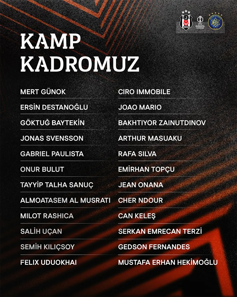 Beşiktaş, UEFA Avrupa Ligi'nde yarın Maccabi Tel-Aviv ile kozlarını paylaşacağı maçın kafilesini duyurdu.