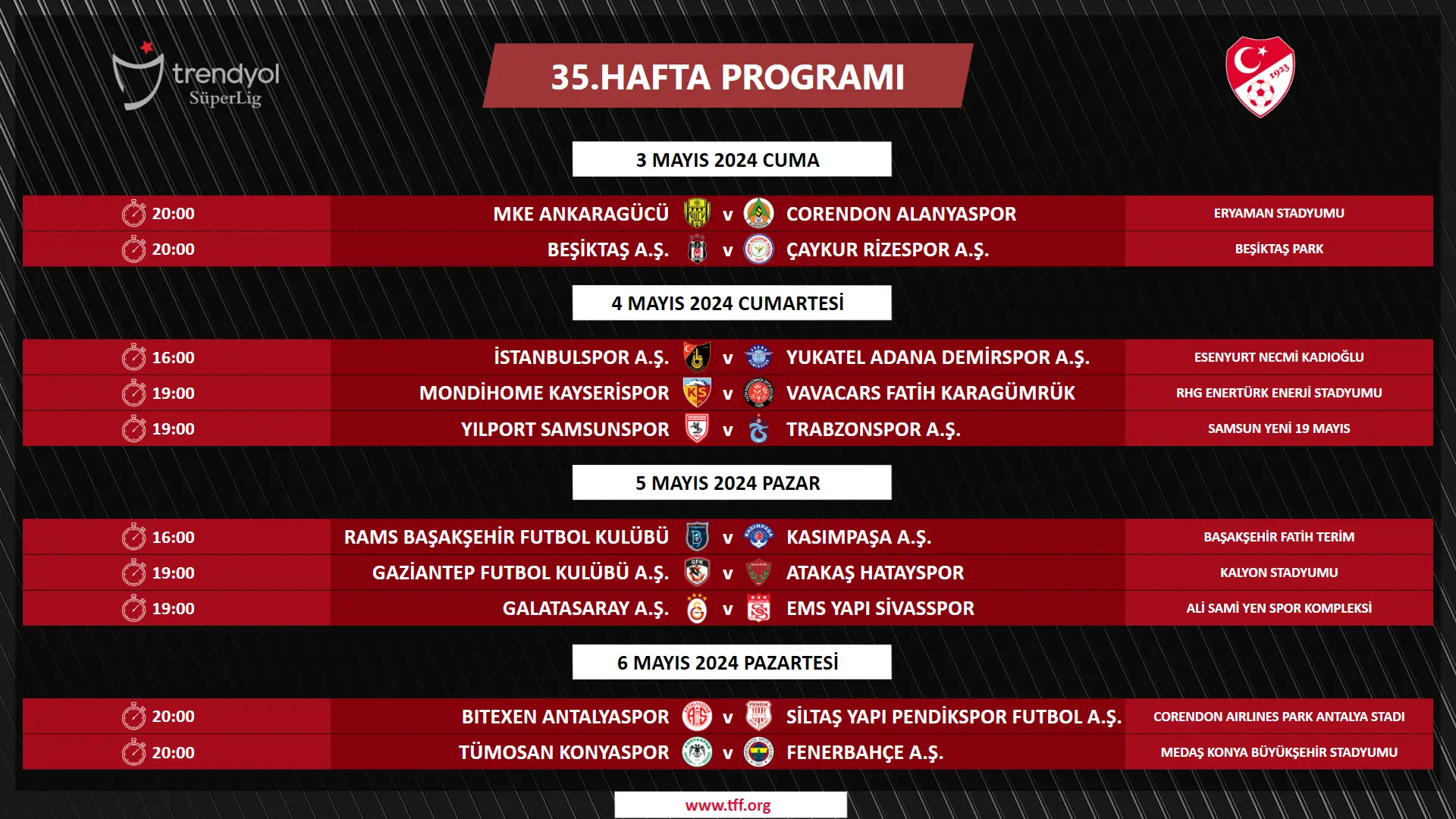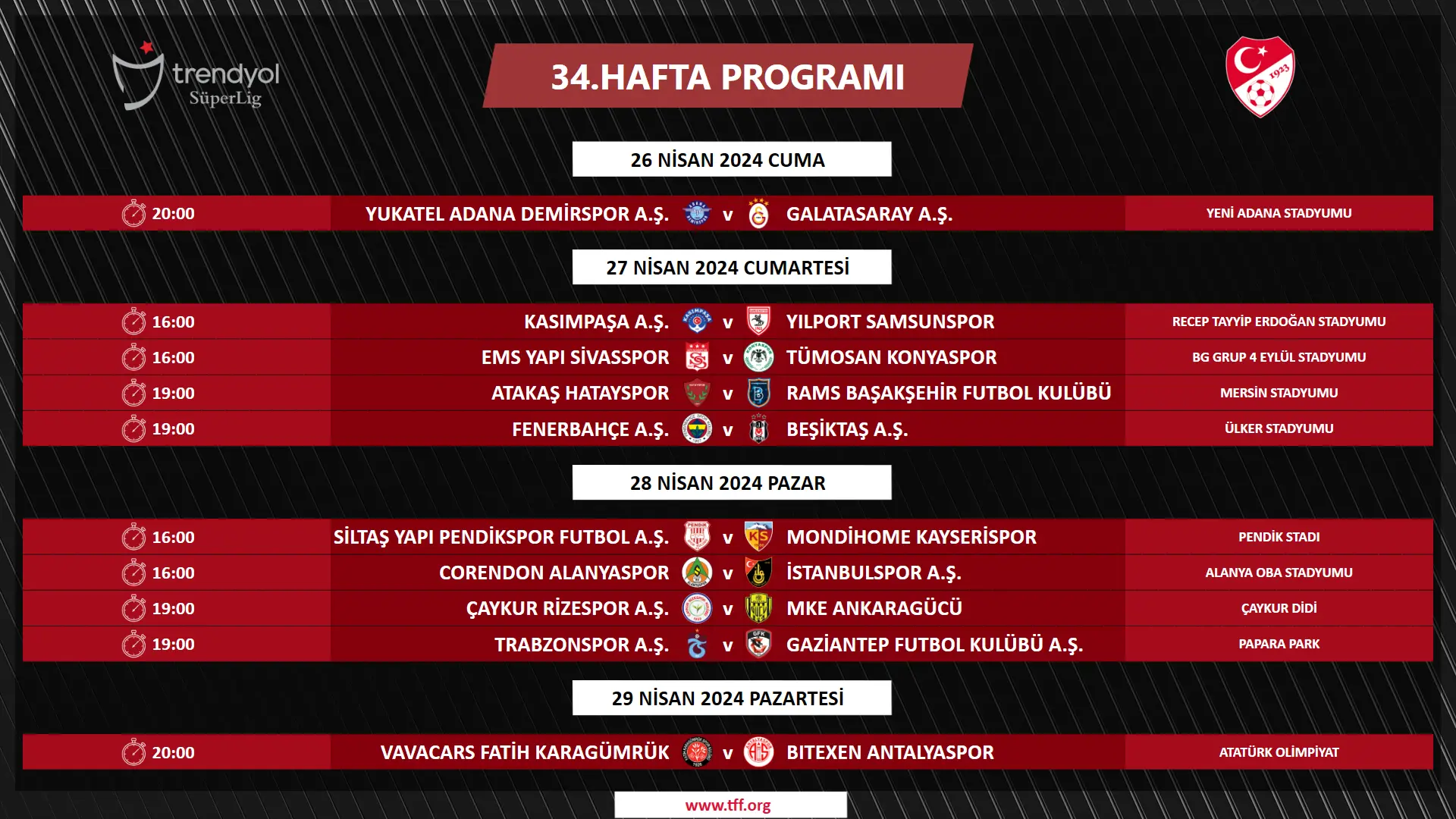 Federasyon'dan yapılan açıklamada ayrıca, "Daha önceki sezonlarda olduğu gibi ligin son 3 haftasında birbirini ilgilendiren maçlar aynı gün ve saatlerde oynatılacaktır." ifadeleri yer aldı.