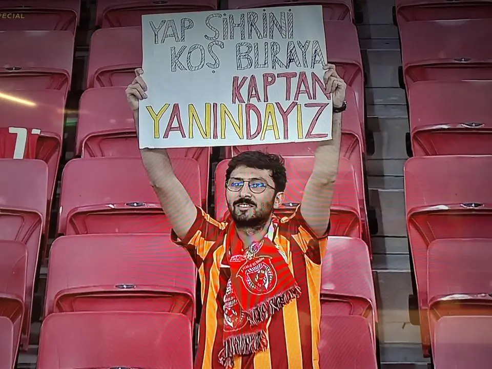 Taraftarın elindeki "Yap sihrini koş buraya kaptan yanındayız" pankartı dikkat çekti.