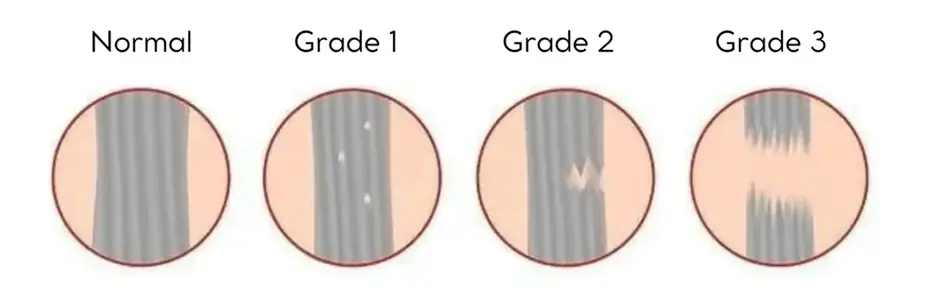 1. derece kas yırtılması (Grade 1): Hafif kas yırtılması olarak adlandırılır. Kas liflerinde küçük çaplı hasarlar meydana gelir. Hafif ağrı, şişlik ve hareket kısıtlılığı ile kendini gösterir. 1. derece (Grade 1) kas yırtıklarının tedavi süresi ortalama 1-3 hafta arasında değişir.
