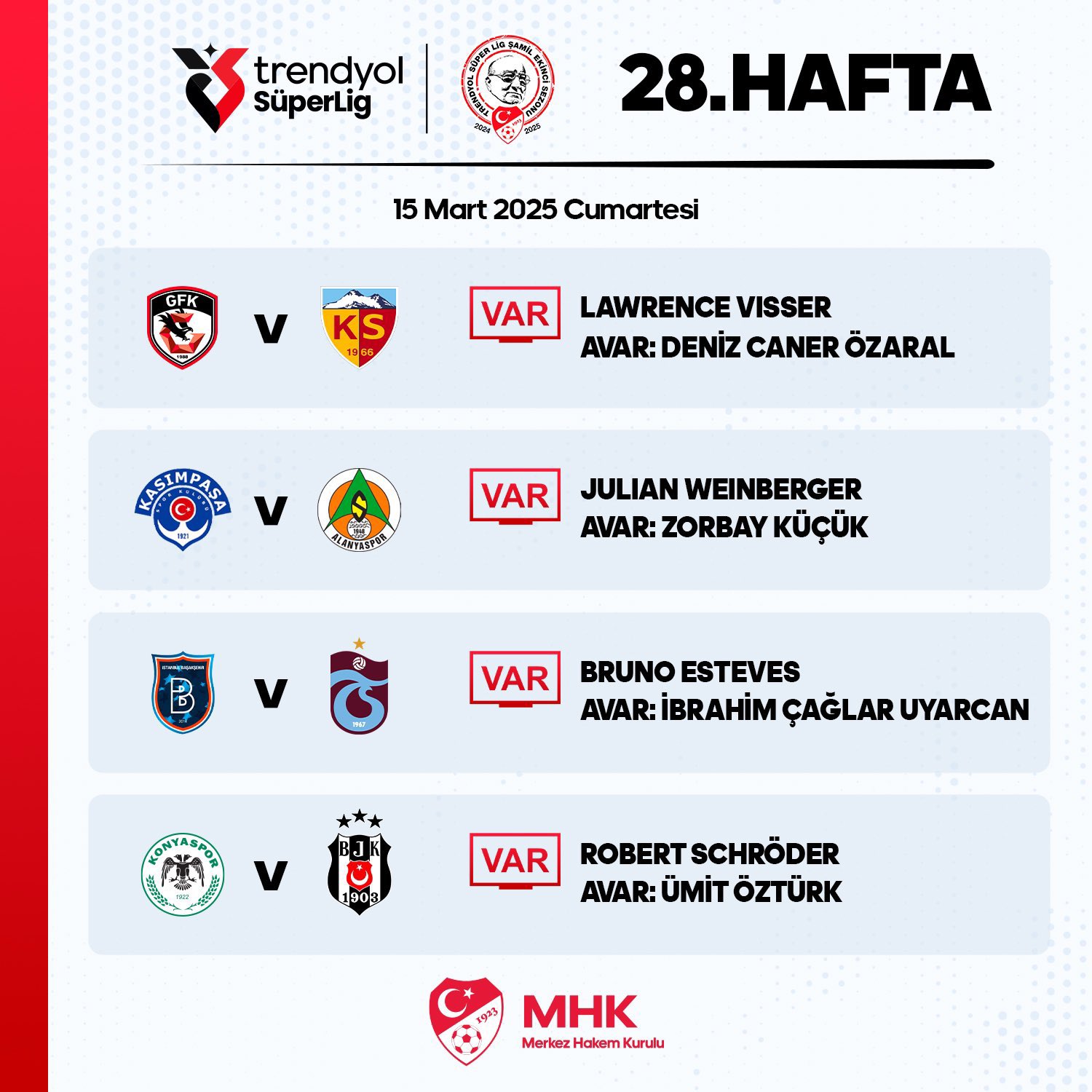 Günün kapanış maçında ise Beşiktaş, Konyaspor deplasmanına çıkacak. Karşılaşmanın VAR hakemi olarak ise Robert Schröder görev yapacak.
