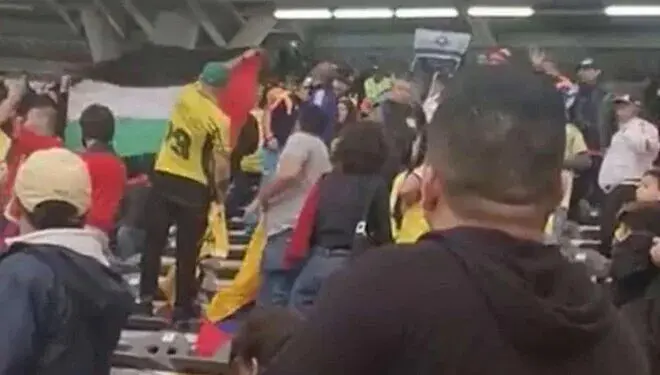 Kolombiya ile İsrail arasında maç devam ederken, İsrail tribününe Filistin bayrağını gösteren Kolombiyalı taraftar ile ona karşılık veren İsrailliler arasında gerginlik yaşandı.
