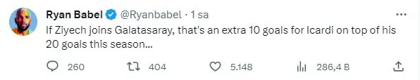Ryan Babel yaptığı paylaşımda Mauro Icardi'nin bu sezon atacağı 20 golün üstüne Hakim Ziyech transferiyle +10 gol daha ekleneceğini iddia etti.