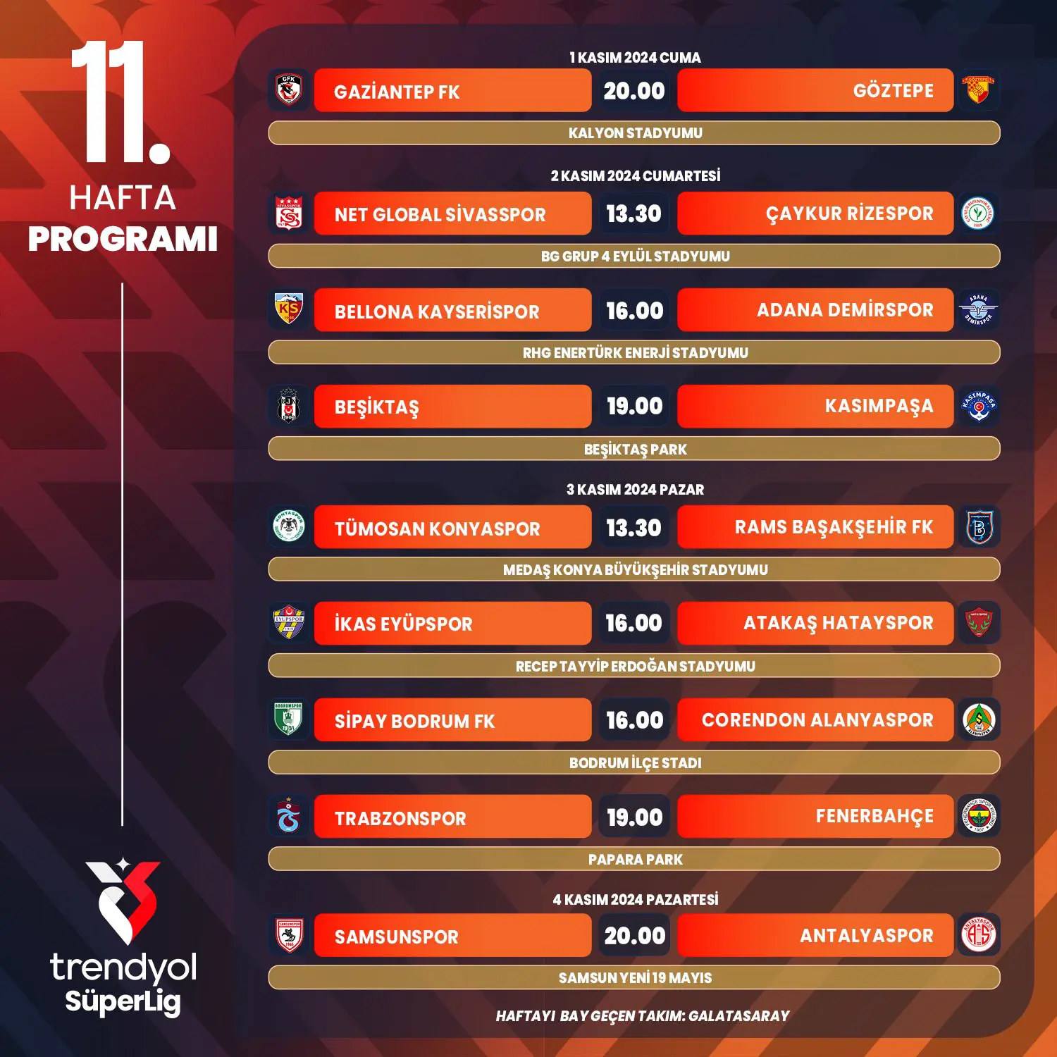 Açıklanan programa göre Galatasaray - Beşiktaş derbisi 28 Ekim Pazartesi saat 20.00'de, Trabzonspor - Fenerbahçe maçı 3 Kasım Pazar günü saat 19.00'da, Beşiktaş - Fenerbahçe derbisi ise 7 Aralık Cumartesi saat 19.00'da, Galatasaray - Trabzonspor maçı ise 16 Aralık Pazartesi saat 21.00'de oynanacak.
