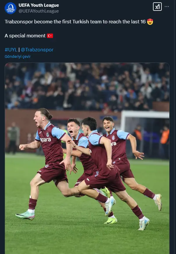 UEFA Gençlik Ligi hesabı, "Trabzonspor, son 16'ya ulaşan ilk Türk takımı oldu. Özel bir an" ifadelerini kullandı.